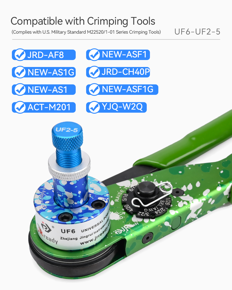 3、Compatible with M22520/1-01 series crimping tools, e.g.: NEW-AS1, NEW-ASF1, YJQ-W2A, YJQ-W2Q, JRD-AF8, etc.